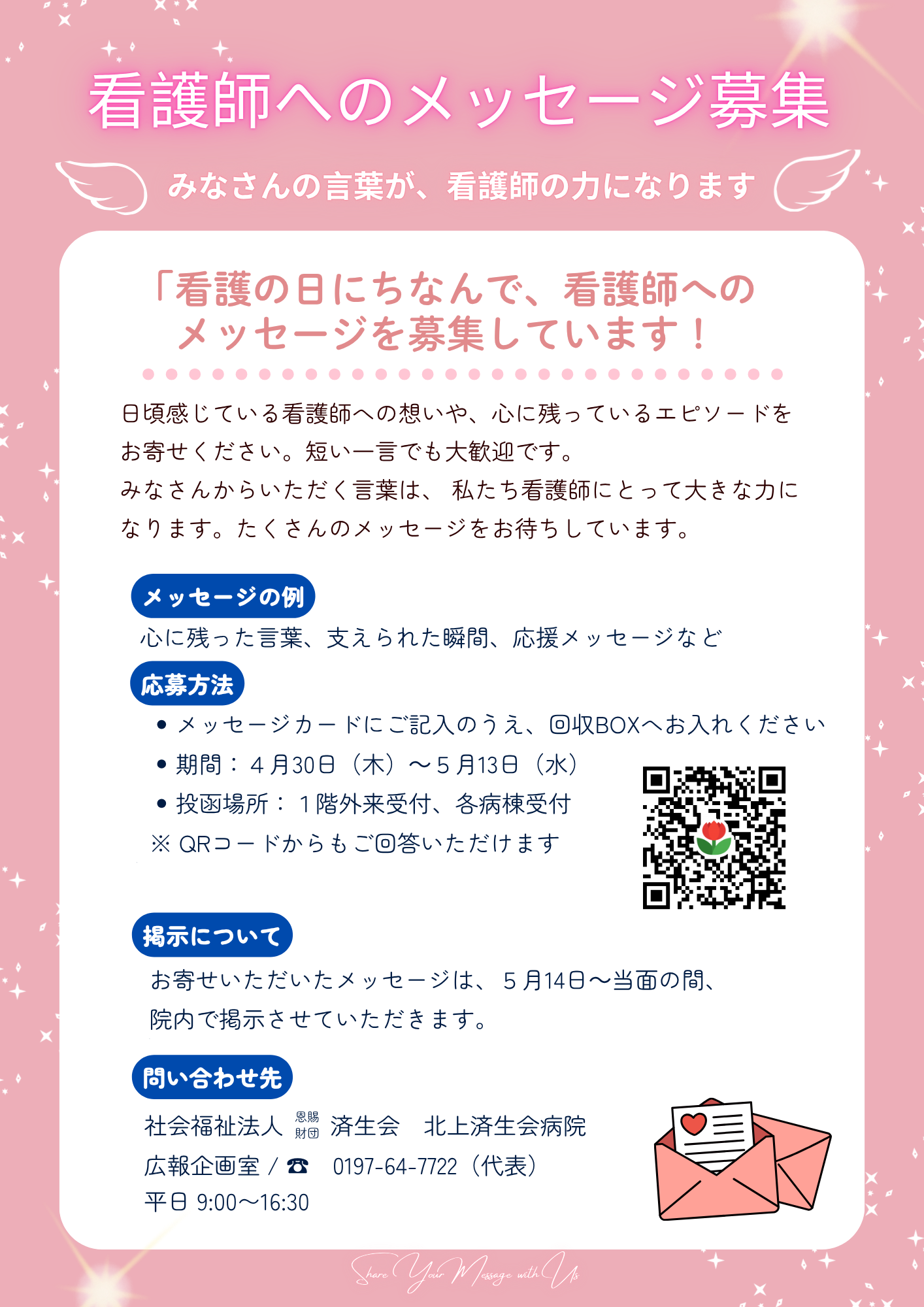 2026.4.20お知らせ 地域医療福祉連携室だより「Baton No.168」を発行しました。 2026.4.10お知らせ 4月13日(月)より面会を一部再開します 2026.3.31お知らせ 「外来診療医師一覧表」、「休診・代診のお知らせ」を更新しました。(2026.4.1現在) 2026.3.31お知らせ 【お知らせ】医療費用保証制度「スマホス+」導入について 2026.3.9お知らせ 臨床研究についてのお願い 2026.2.27お知らせ 「外来診療医師一覧表」、「休診・代診のお知らせ」を更新しました。(2026.3.1現在) 2026.2.4お知らせ 「外来診療医師一覧表」、「休診・代診のお知らせ」を更新しました。(2026.2.1現在) 2025.12.26お知らせ 「外来診療医師一覧表」、「休診・代診のお知らせ」を更新しました。(2026.1.1現在) 2025.12.16お知らせ 紹介状なしで受診する場合の 負担料金(選定療養費)変更のお知らせ 2025.12.15お知らせ 料金改定のお知らせ 2026.4.20お知らせ 地域医療福祉連携室だより「Baton No.168」を発行しました。 2026.4.10お知らせ 4月13日(月)より面会を一部再開します 2026.3.31お知らせ 「外来診療医師一覧表」、「休診・代診のお知らせ」を更新しました。(2026.4.1現在) 2026.3.31お知らせ 【お知らせ】医療費用保証制度「スマホス+」導入について 2026.3.9お知らせ 臨床研究についてのお願い 2026.2.27お知らせ 「外来診療医師一覧表」、「休診・代診のお知らせ」を更新しました。(2026.3.1現在) 2026.2.4お知らせ 「外来診療医師一覧表」、「休診・代診のお知らせ」を更新しました。(2026.2.1現在) 2025.12.26お知らせ 「外来診療医師一覧表」、「休診・代診のお知らせ」を更新しました。(2026.1.1現在) 2025.12.16お知らせ 紹介状なしで受診する場合の 負担料金(選定療養費)変更のお知らせ 2025.12.15お知らせ 料金改定のお知らせ 2026.4.20お知らせ 地域医療福祉連携室だより「Baton No.168」を発行しました。 2026.4.10お知らせ 4月13日(月)より面会を一部再開します 2026.3.31お知らせ 「外来診療医師一覧表」、「休診・代診のお知らせ」を更新しました。(2026.4.1現在) 2026.3.31お知らせ 【お知らせ】医療費用保証制度「スマホス+」導入について 2026.2.27お知らせ 「外来診療医師一覧表」、「休診・代診のお知らせ」を更新しました。(2026.3.1現在) 2026.2.4お知らせ 「外来診療医師一覧表」、「休診・代診のお知らせ」を更新しました。(2026.2.1現在) 2025.12.26お知らせ 「外来診療医師一覧表」、「休診・代診のお知らせ」を更新しました。(2026.1.1現在) 2025.12.16お知らせ 紹介状なしで受診する場合の 負担料金(選定療養費)変更のお知らせ 2025.11.7お知らせ 「外来診療医師一覧表」、「休診・代診のお知らせ」を更新しました。(2025.11.1現在) 2025.10.1お知らせ 「外来診療医師一覧表」、「休診・代診のお知らせ」を更新しました。(2025.10.1現在) 2025.4.9お知らせ 採用情報(正職員) 2025.1.27お知らせ 採用情報(正職員) 2026.4.10お知らせ 4月13日(月)より面会を一部再開します 2025.11.21お知らせ インフルエンザ感染拡大に伴う面会禁止のお知らせ(2025年11月20日~) 2024.11.5感染症関連 面会制限について 2024.5.23一般向け 院内感染対策のお願い 2025.11.17お知らせ 済生会フェア2025が開催されました。 2025.9.30お知らせ 第6回 市民公開講座開催のお知らせ 2025.9.30お知らせ 北上済生会病院presents「地域と共に」(10月の放送予定)のお知らせ 2025.7.16お知らせ 第5回市民公開講座のご案内【きたポ対象】 2025.7.1お知らせ 北上済生会病院presents「地域と共に」(7月の放送予定) 2025.5.13お知らせ 済生会フェア2025のお知らせ 2025.5.9お知らせ 看護の日イベントのお知らせ 2025.4.28お知らせ 北上済生会病院presents「地域と共に」(5月の放送予定) 2024.8.30イベント FMラジオ番組のご案内 2024.7.11イベント プレパパママ教室再開のお知らせ