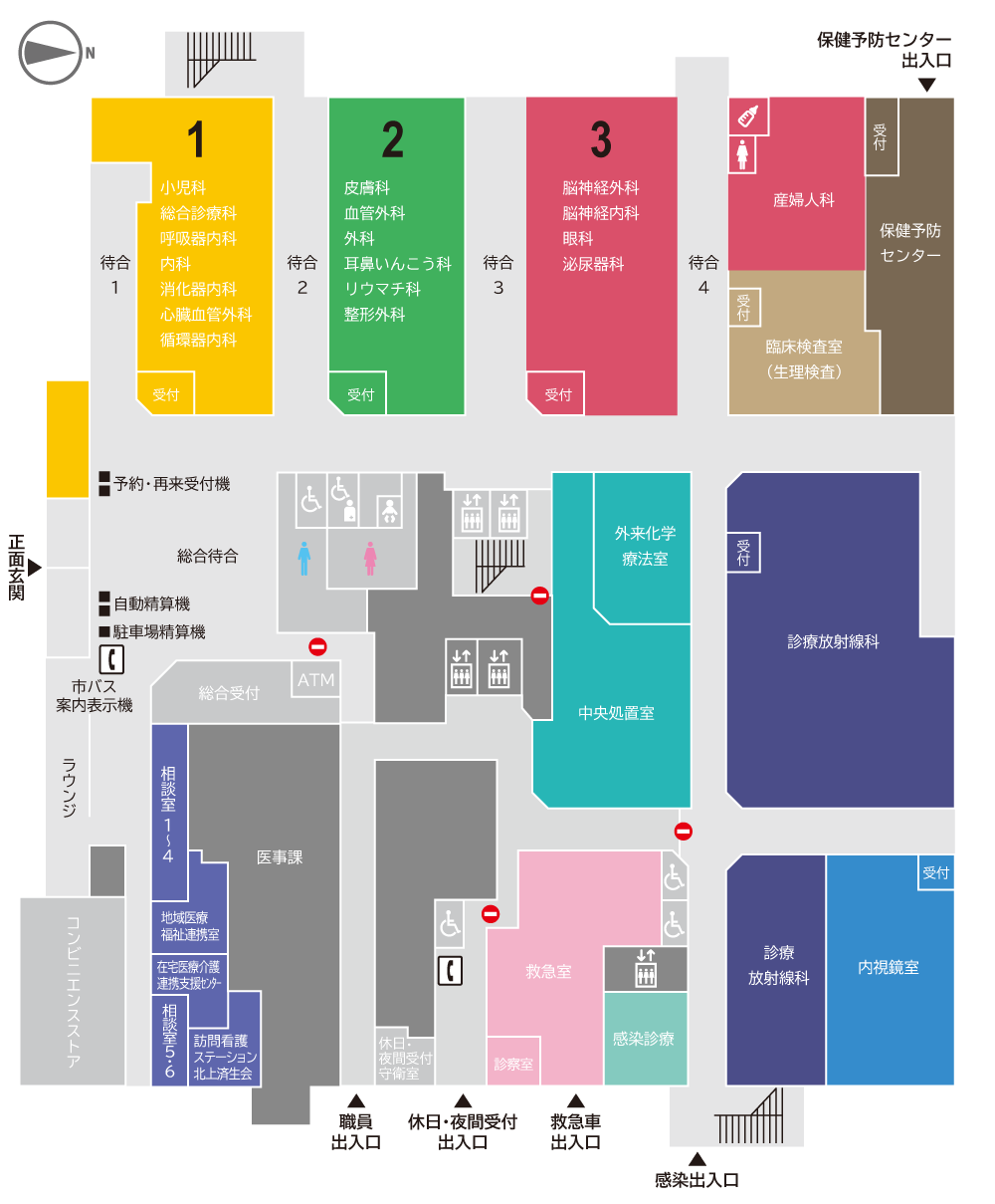 1階には外来や救急、検査部門の他にも、総合待合、ラウンジ、コンビニエンスストアなどがあります。
